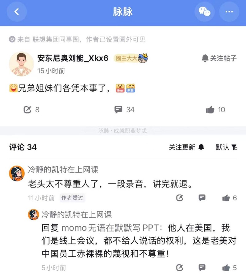 另有网友疑似就赔偿问题发帖称,“兄弟姐妹们各凭本事了”;该帖子下有疑似联想员工评论称,“老头”太不尊重人,一段录音讲完就退。他进一步指出,“他人在美国,我们是线上会议,都不给人说话的权利”。不过,尚不清楚这名网友口中的“老头”具体指代谁。还有很多认证信息为联想员工的网友透露了更多信息。